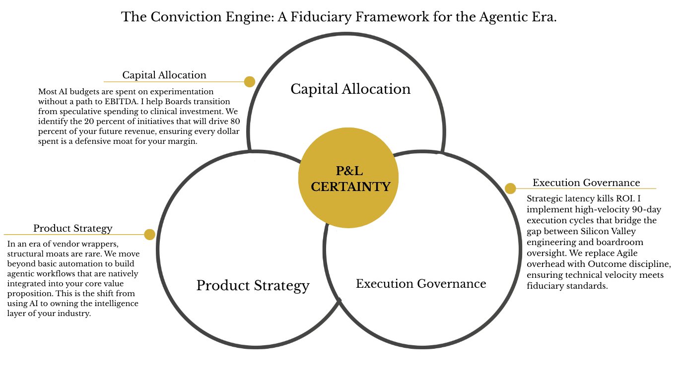 Right now, Enterprise Boards are approving 8-figure AI budgets while seeing 0-figure impact on the P&L. I call this the AI ROI Mirage. I help leadership teams move beyond “Pilot Purgatory” to align capital, product, and execution for measurable financial certainty.